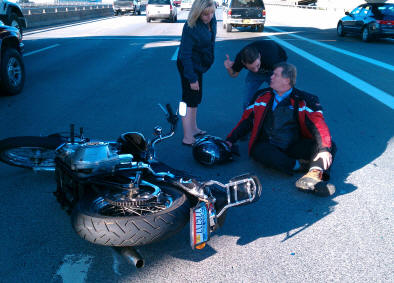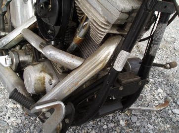 | Not so fun was getting rear-ended on I787 on the way home after work. Twenty-something kid in a pickup hit me from behind in slowing traffic. I never heard or saw it coming and got tossed down the highway sliding for about 40 feet. State police, EMT's, traffic tied up. But I didn't get hurt other than scraped left shin and bruised buttocks. Lucky, lucky. The tank and mufflers were scraped on the right side and the front forks were bent back. The rear fender was bent as was the rear sissy bar. |