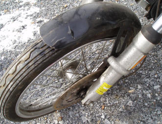 | I pick it up in the spring of 2011, minus the nice tank decals and rear rack, but with a fine paint job and new forks, front wheel, and rear fender/license carrier repaired. |