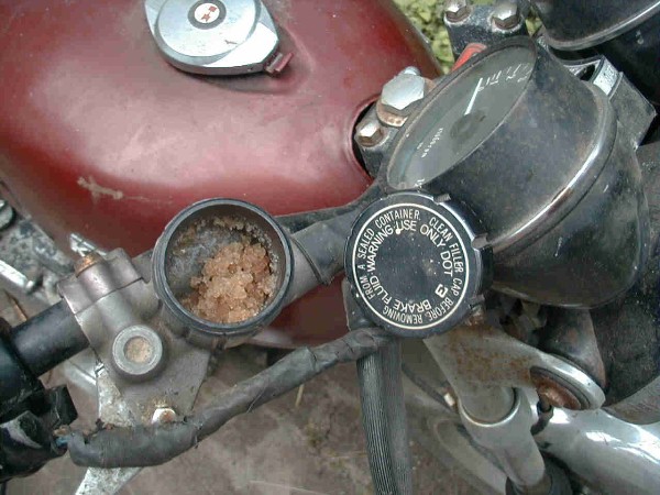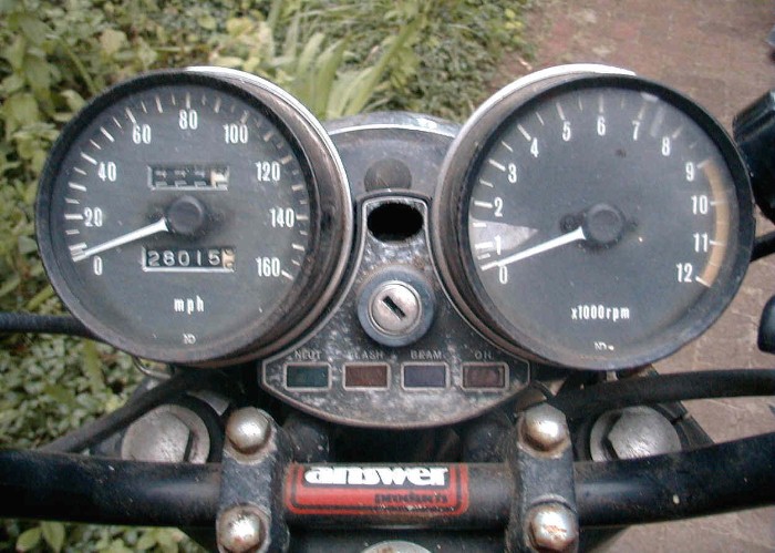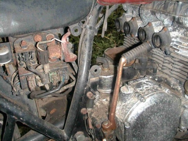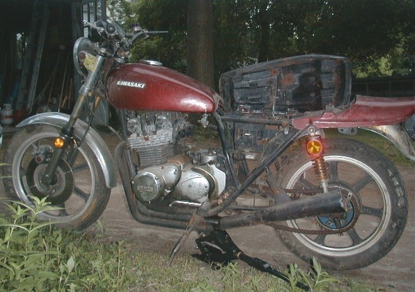 | Why I got this bike August 2001. I've got two nicely running, current model, street bikes and half ownership of a 70's era drag bike. Blasting down a two-lane, coming back from a Saturday afternoon ride, I spot a bike on the roadside, obviously for sale. At 70 mph all I recognize is the left sidecover of what looks like an old Kawasaki. It takes me a 1/4 mile to stop and turn around to go back and look at what it might be. I figure to be an early Kawasaki 900. The owner is working on his new Harley in the garage. A few moments conversation tells me that this bike has sat for many years. I ask what he thinks it's worth and he answers only "make me an offer." I offer $50 to start things off and he accepts it straight away. I waste no time coming back with the van to get it. In the light of the next day it turns out to be a 1973 Z1. The first year of import to the US. It is missing the carbs, the header and muffler is garbage, there's an animal nest under the torn seat, rotted gas in the tank, coagulated gel for brake fluid, rust, weathering and oxidation everywhere, and a truly vile smell. But it is a very early Z1, confirmed by the engine number. Needs some work  |