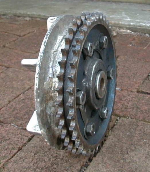 | There are Allen head bolts all around and an oil pressure gauge. The wheels are after-market Lesters. The most interesting item is a double row chain with a matching double sprocket. I have never seen this before. That the carbs are missing suggests that they might have been smooth bores that were taken off for their value. John and I believe this is a "worked" engine. |