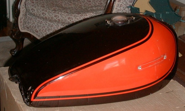 | Opening it up In December, we yank out the engine in my driveway and careen it down the steps to the basement where we start the teardown. We quickly find that the valve cover has been "relieved" and see the higher lift cams. This confirms the performance modification. Pistons are oversized as well. I sell the wheels for $150 and use that money to buy wire wheels and a very nice original gas tank for $400 total.