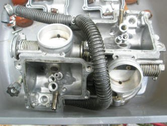 The carburetors leaked gas into the crankcase, so I removed them again and replaced the float valves and seats. The right side carb did have a stuck spring in the float valve and maybe some dirt on the seat. This fixed the problem.  |